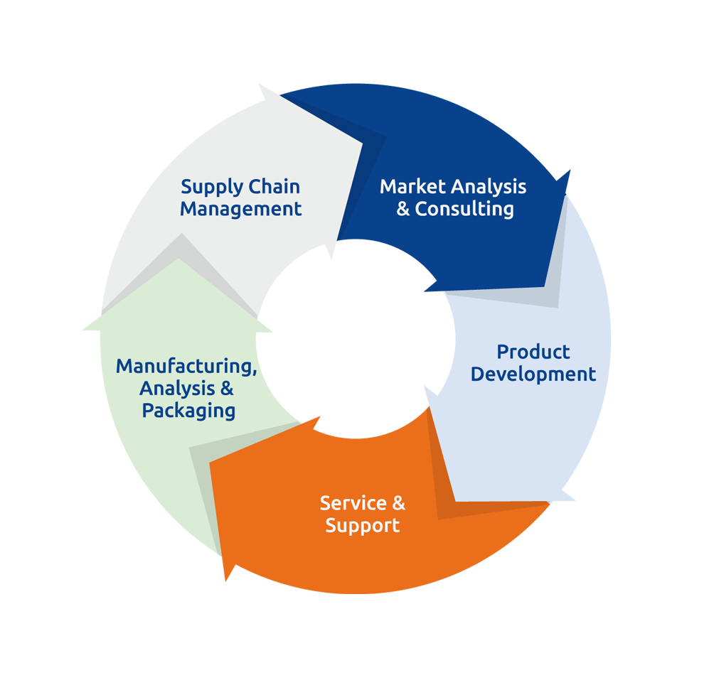 Für bestmöglichen Kundenservice umfasst unser Portfolio: Marktanalyse, Konzeption/Entwicklung, Inverkehrbringen und die komplette Abwicklung der Supply Chain – unterstützt durch fundierte Beratungsleistungen auf allen Stufen.